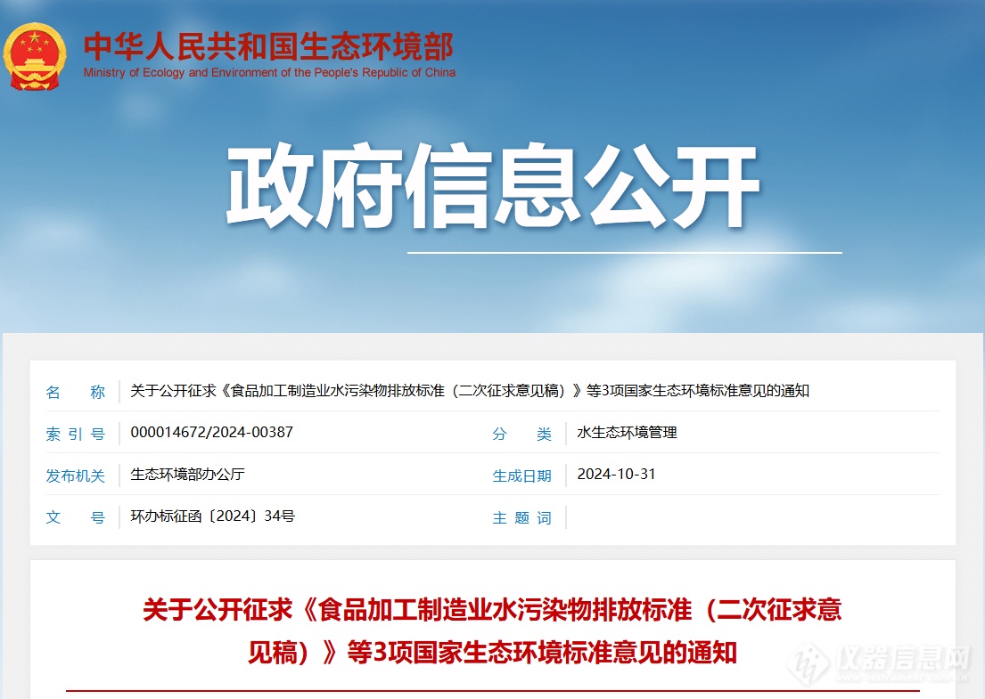 關于公開征求《食品加工制造業水污染物排放標準(二次征求意見稿)》等3項國家生態環境標準意見的通知