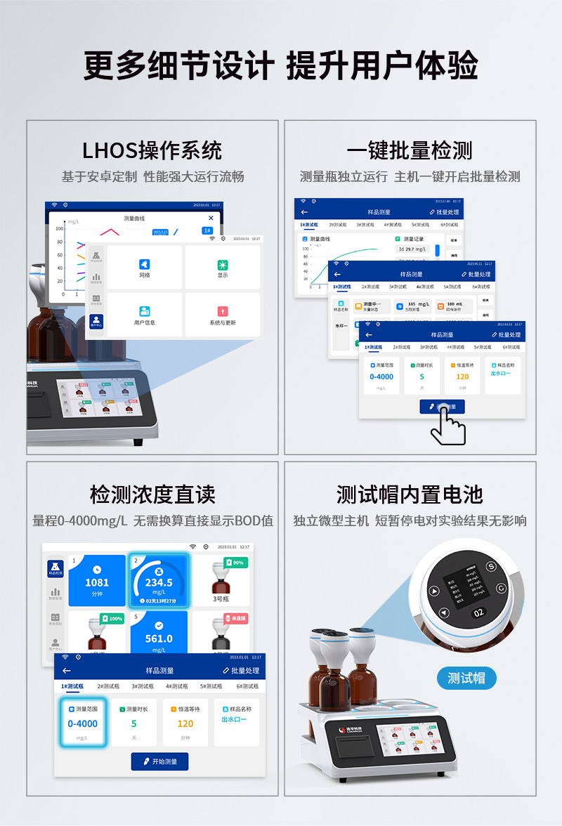 4.量程0-4000mg/L,檢測濃度直讀,無需換算直接顯示BOD值,采用安卓系統算法更新,硬件升級低量程測值更準;