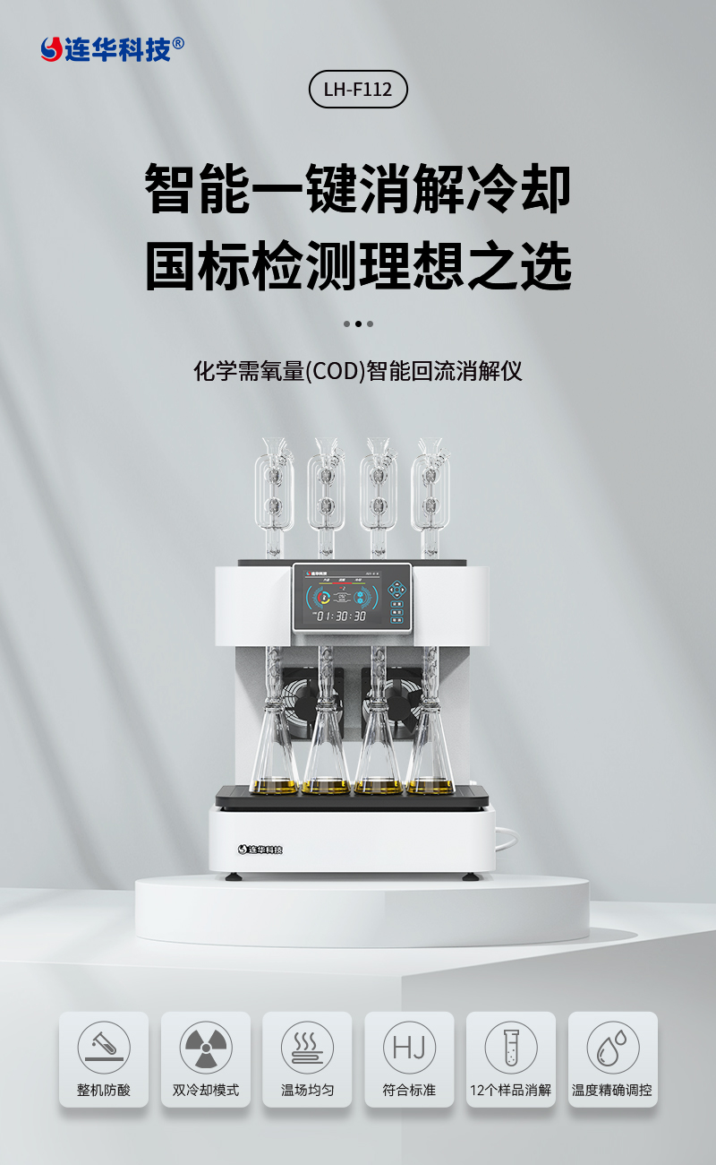 化學(xué)需氧量(COD)智能回流消解儀LH-F112 該儀器依據(jù)國家新標(biāo)準(zhǔn)《HJ828-2017 水質(zhì)化學(xué)需氧量的測定重鉻酸鹽法》設(shè)計制造,同時兼顧原國標(biāo),適用于各種生活用水和工業(yè)廢水的檢測,儀器內(nèi)置回流系統(tǒng),可智能定時,操作簡單